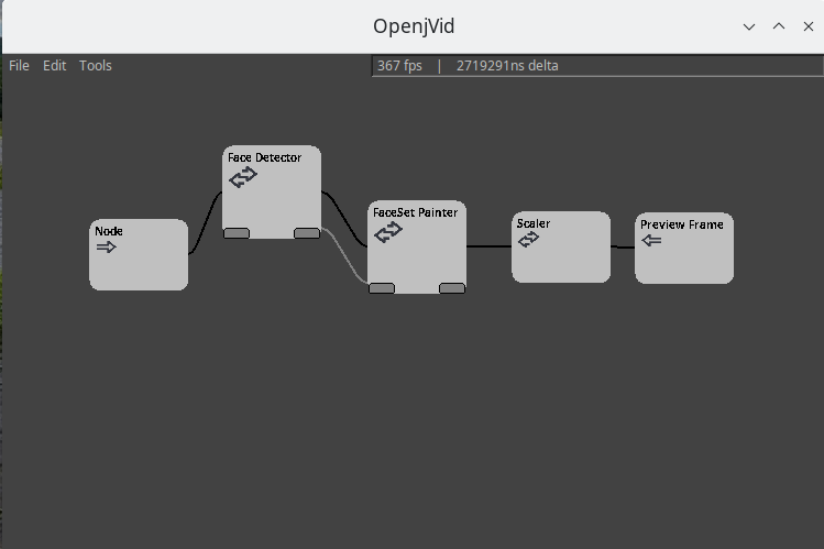 OpenJVID supports more advanced signal flow combinations. One example is the below image. This flow ingests video from a camera using GStreamer, and pipes it into a face detection digestor, which uses OpenCV & Deep Learning to identify facial features. Those facial datasets are then piped using Control Node Points into the FaceSet painter digest, which paints a rectangle around the subject in the frame. Once the paint is completed, the video is scaled and then previewed in a PreviewFrame.